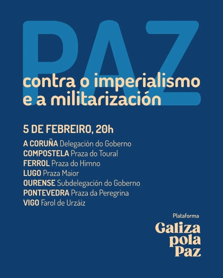 Súmate á mobilización de Galiza pola paz o vindeiro xoves 5 de febreiro ás 20h na praza da Peregrina en Pontevedra.